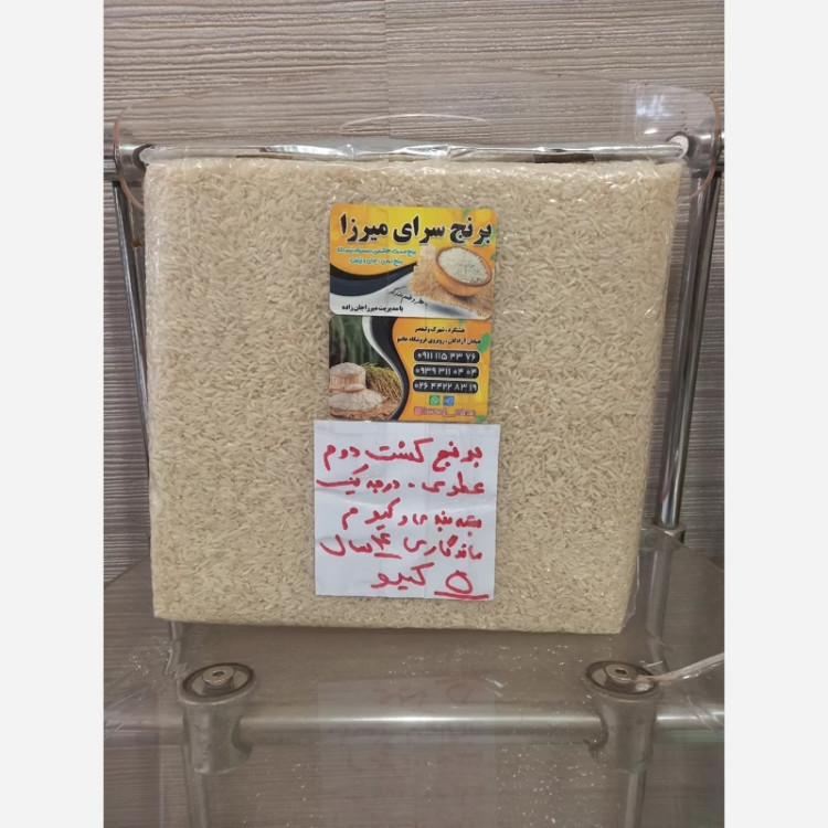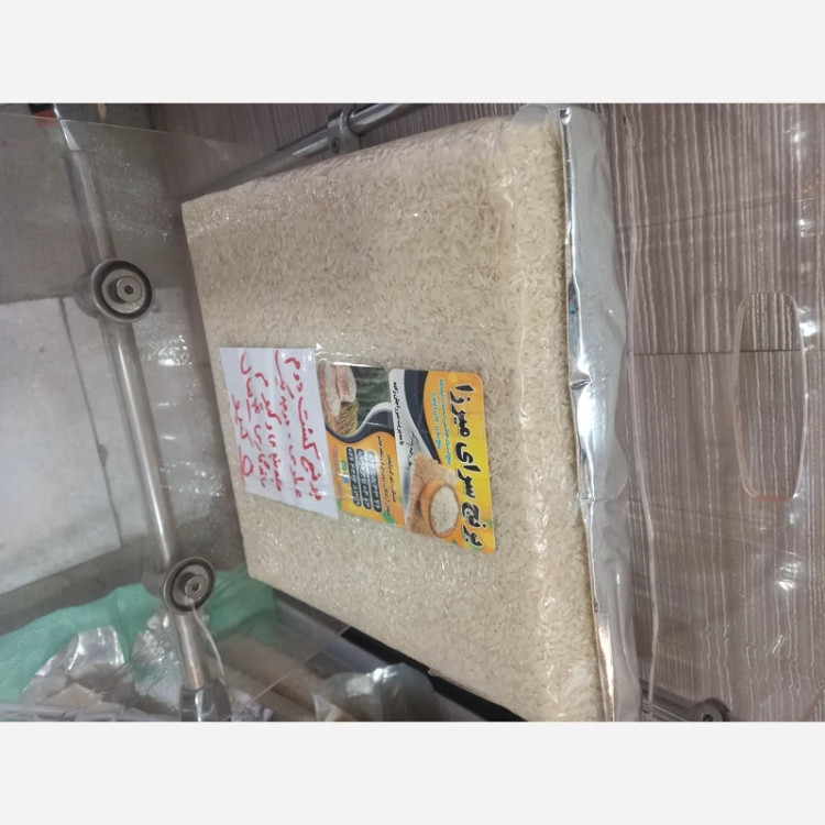 برنج هاشمی کشت دوم 5کیلویی بابسته بندی جدید وکیوم شده من مشکل اصلی نگهداری برنج رو که از دست دادن عطر وزدن حشره بود را بااین بسته بندی که کامل هوا ورطوبت را کشیده وحدف کردم بااین بسته بندی ماندگاری تا 5سال بدون مشکل وحشره میشه حفط کرد به هیچ وجه حشره نمیتونه بوجود بیاد چون هوا کامل خالی میشه وهیج موجودی بدون هوا زنده نمیمونه .باسپاس